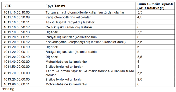 Yukarıdaki tabloda gümrük tarife istatistik pozisyonu (GTİP) ve tanımı belirtilen eşyanın (yalnız karşısında gösterilen
