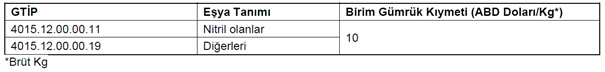 eldivenlerin ithalatında uygulanan birim gözetim kıymeti 4,5 ABD Doları/kg/brüt iken 10 ABD Doları/kg/brüt olarak