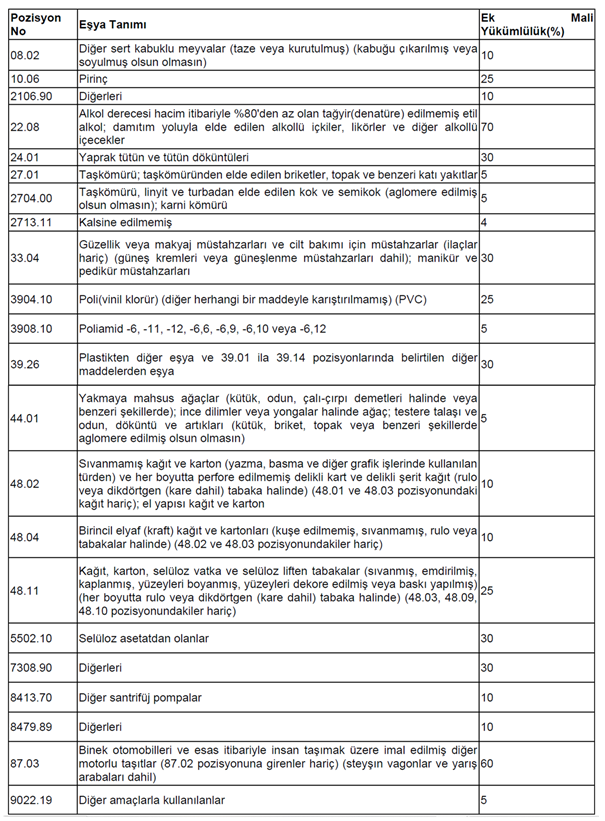 aşağıda tabloda yer alan eşyaların ABD menşeli olanlarının ithalatında karşılarında gösterilen oranlarda ek mali